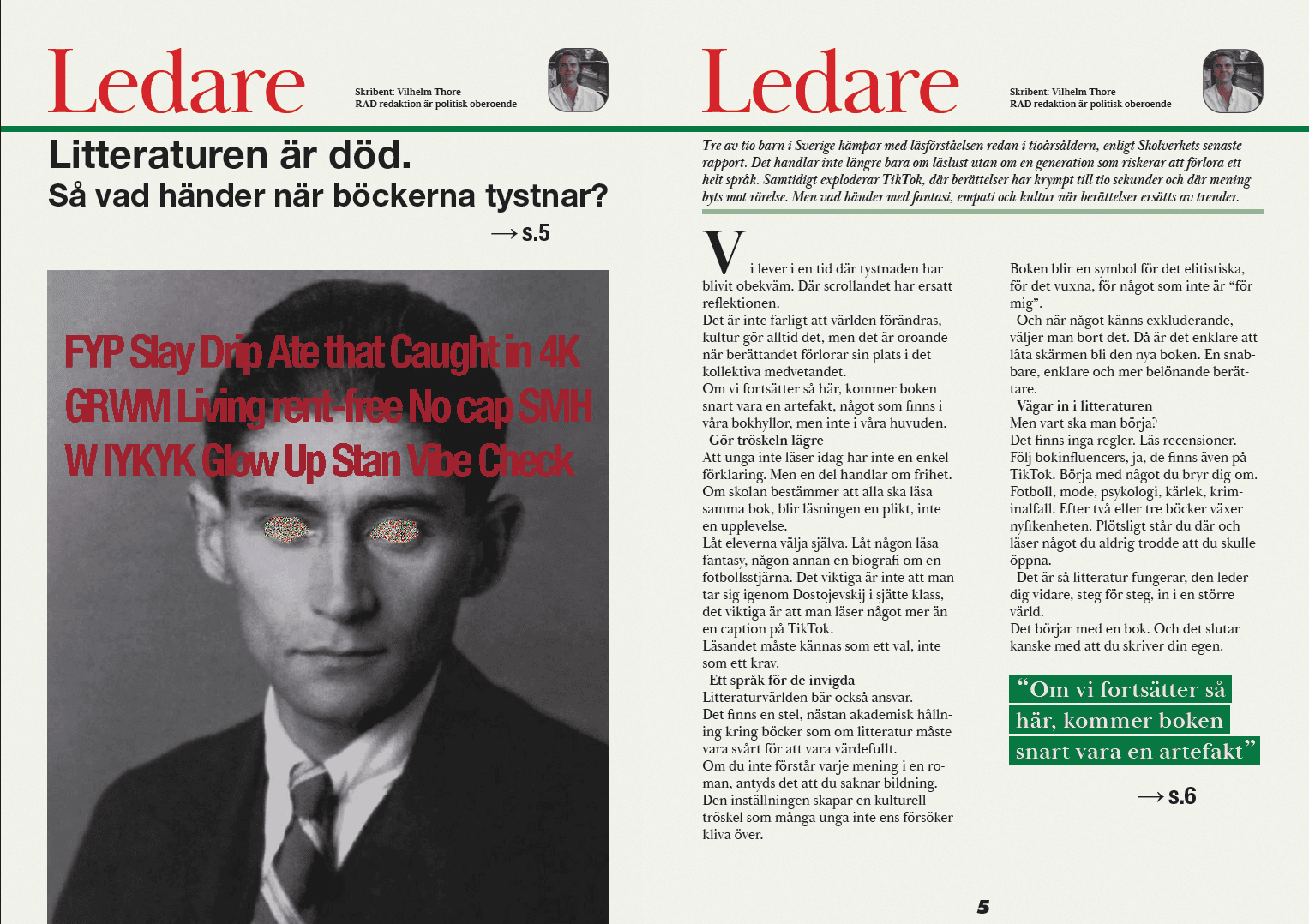 The goal was to design a magazine that feels visually distinctive while supporting different types of editorial content, including articles, opinion pieces, and data-driven pages.