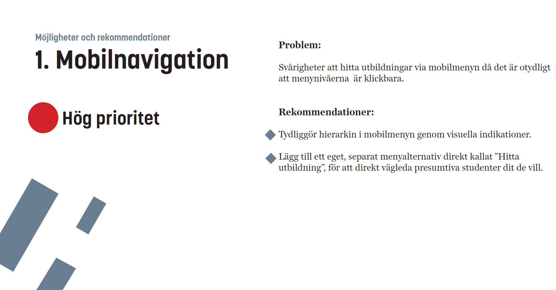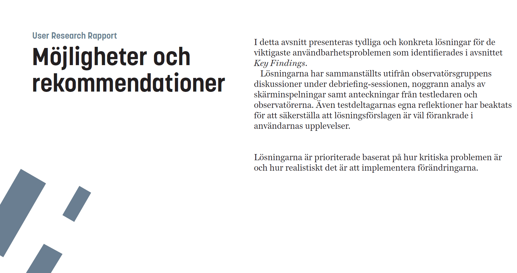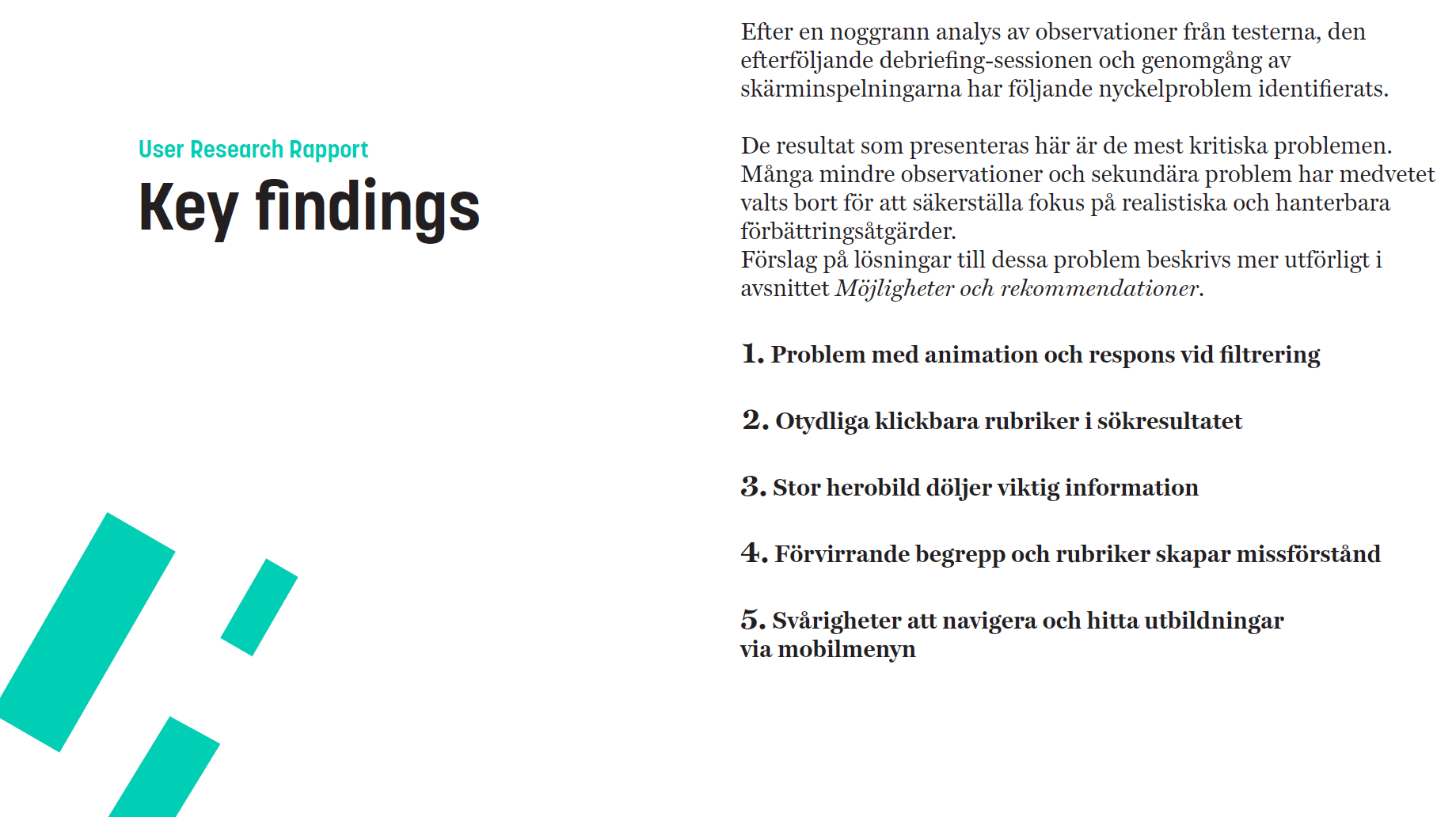 The research resulted in a prioritized list of usability issues and recommendations. These insights can support future improvements to navigation structure, labeling, and information clarity.